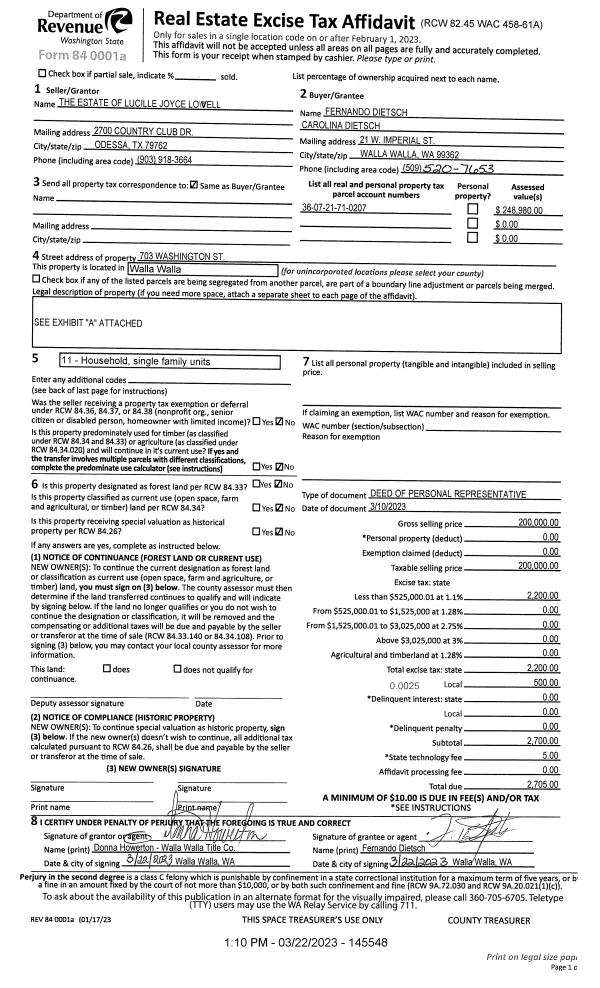 | 1 | 03/22/2023 | DPR | DEED OF PERSONAL REPRESENTATIVE | LOVELL LUCILLE JOYCE ESTATE OF | DIETSCH FERNANDO & CAROLINA | | | $200,000.00 | 145548 | 2023-01469 |