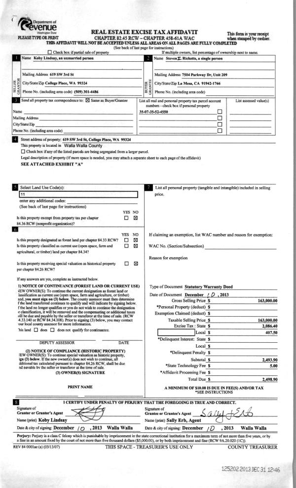 | 1 | 12/31/2013 | WARRANTY D | WARRANTY DEED | LINDSAY KOBY | RICKETTS STEVEN I | | | $163,000.00 | 125202 | 2013-12378 |