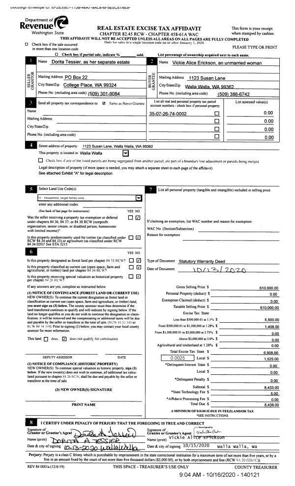| 1 | 10/16/2020 | SWD | STATUTORY WARRANTY DEED | TESSIER DORITA A | ERICKSON VICKIE ALICE | | | $610,000.00 | 140121 | 2020-10716 |