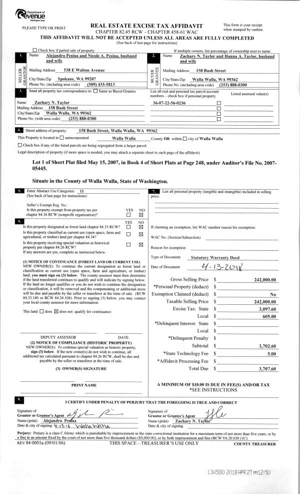 | 2 | 04/27/2018 | SWD | STATUTORY WARRANTY DEED | PESINA ALEJANDRO & NICOLE A | TAYLOR ZACHARY N & HANNA A | | | $242,000.00 | 134580 | 2018-03321 |