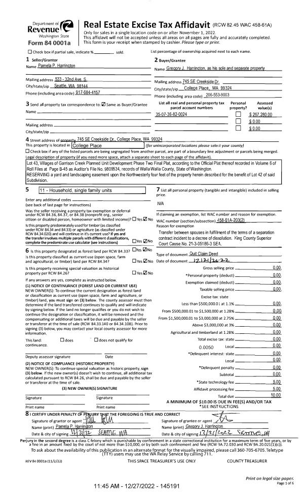 | 1 | 12/27/2022 | QCD | QUIT CLAIM DEED | HARRINGTON PAMELA P | HARRINGTON GREGORY J | | | $0.00 | 145191 | 2022-09915 |
