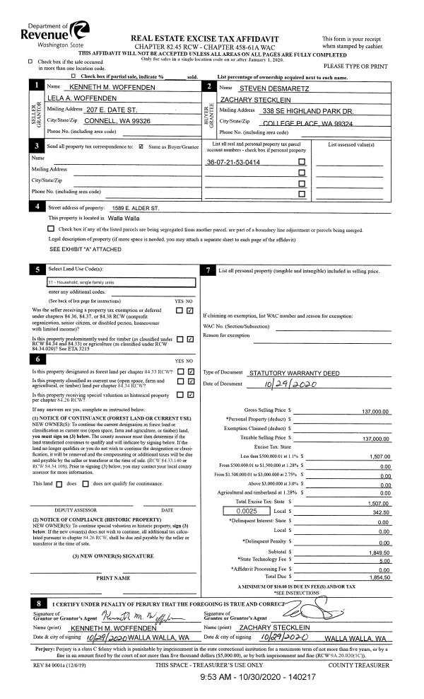 | 3 | 10/30/2020 | SWD | STATUTORY WARRANTY DEED | WOFFENDEN KENNETH M & LELA A | DESMARETZ STEVEN | | | $137,000.00 | 140217 | 2020-11318 |