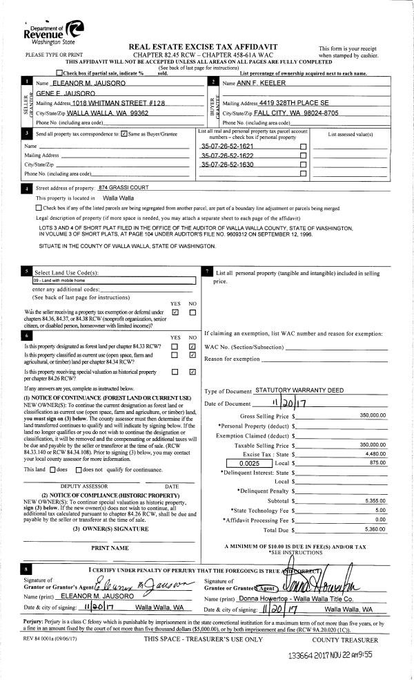 | 1 | 11/22/2017 | SWD | STATUTORY WARRANTY DEED | JAUSORO ELEANOR | KEELER ANN F | | 3-PARCELS | $0.00 | 133664 | 2017-09411 |