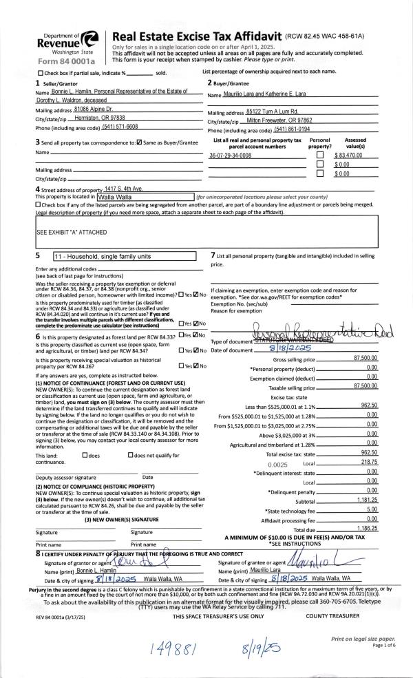 | 1 | 08/19/2025 | DPR | DEED OF PERSONAL REPRESENTATIVE | WALDRON DOROTHY L | LARA MAURILIO & KATHERINE E | | | $87,500.00 | 149881 | 2025-04925 |