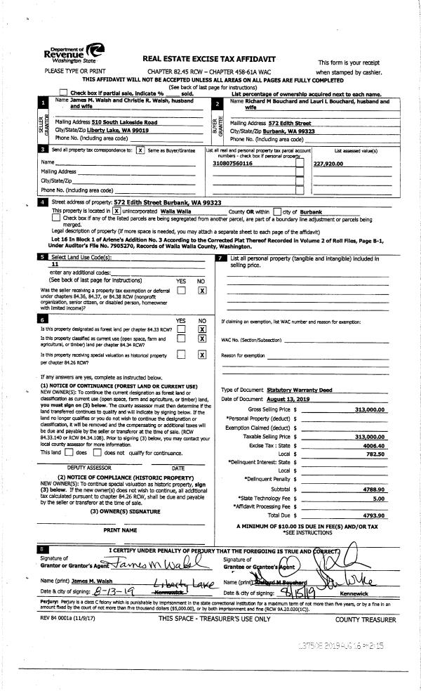 | 2 | 08/16/2019 | SWD | STATUTORY WARRANTY DEED | WALSH JAMES M & CHRISTIE | BOUCHARD RICHARD M & LAURI L | | | $313,000.00 | 137508 | 2019-06218 |
