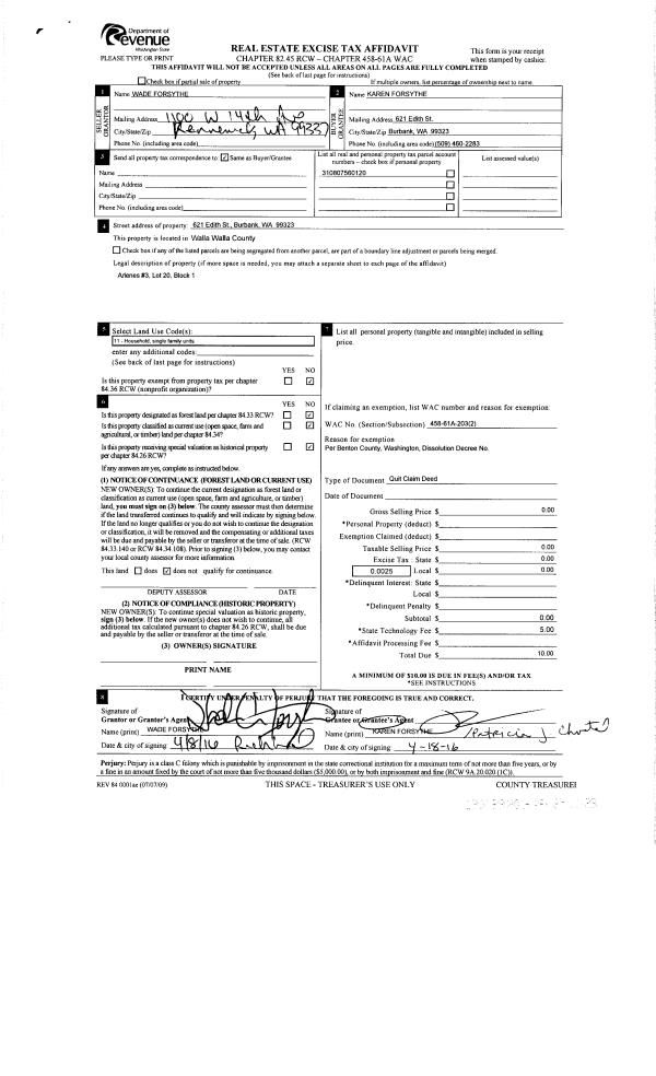 | 1 | 04/18/2016 | QCD | QUIT CLAIM DEED | FORSYTHE WADE A & KAREN I | FORSYTHE KAREN | | | | 130088 | 2016-03042 |
