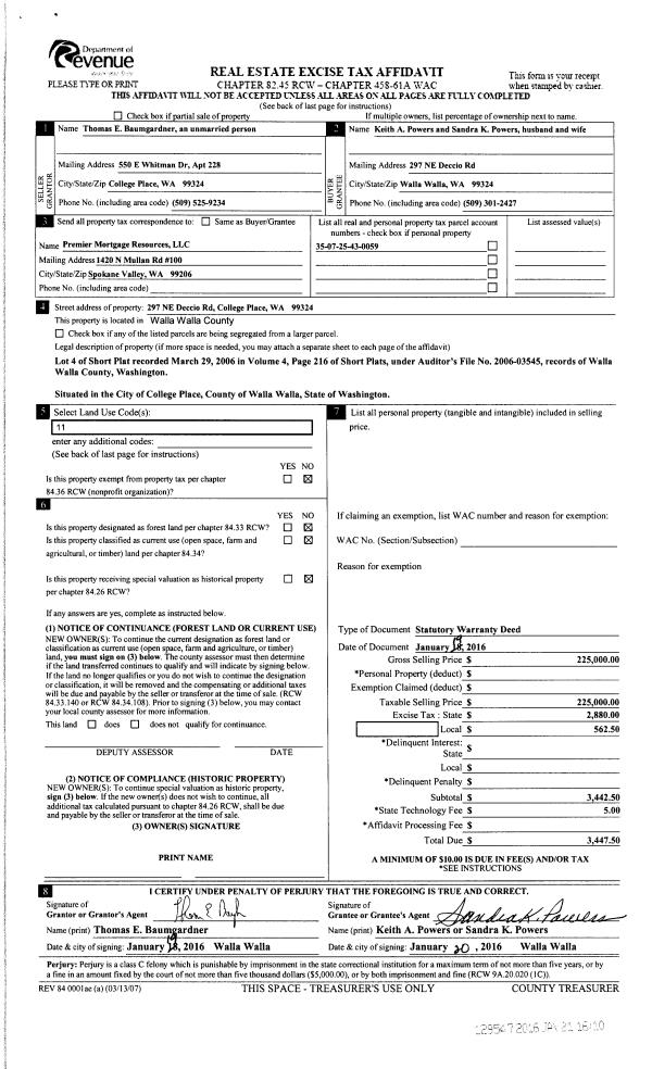 | 1 | 01/21/2016 | SWD | STATUTORY WARRANTY DEED | BAUMGARDNER THOMAS E & CHERYL L | POWERS KEITH A & SANDRA K | | | $225,000.00 | 129547 | 2016-00488 |