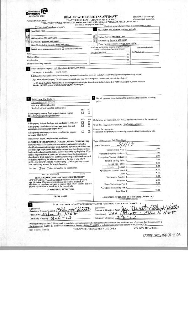 | 5 | 03/07/2013 | QCD | QUIT CLAIM DEED | HIATT, ELDON | HIATT, ELDON & JAN | | | $0.00 | 123551 | 2013-02093 |
