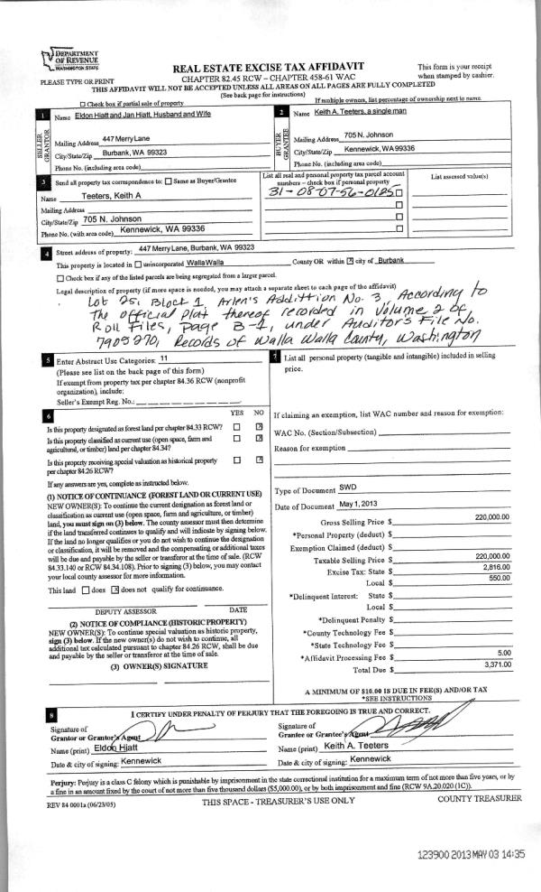 | 4 | 05/03/2013 | WARRANTY D | WARRANTY DEED | HIATT, ELDON & JAN | TEETERS, KEITH A | | | $220,000.00 | 123900 | 2013-04398 |