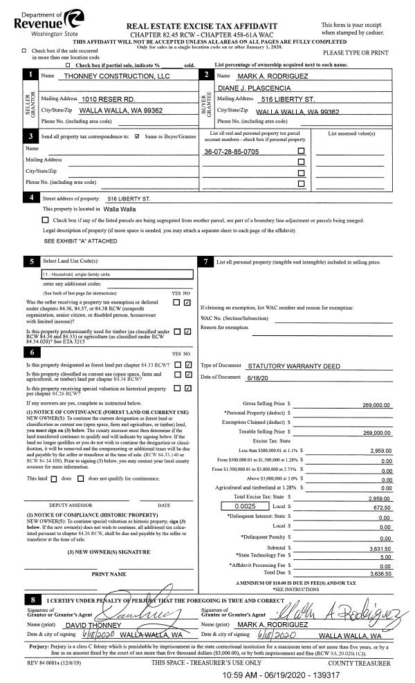 | 1 | 06/19/2020 | SWD | STATUTORY WARRANTY DEED | THONNEY CONSTRUCTION LLC | RODRIGUEZ MARK A & DIANE J PLASCENCIA | | | $269,000.00 | 139317 | 2020-05646 |