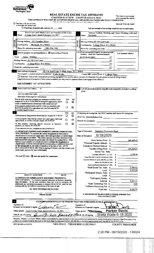 | 1 | 06/19/2020 | SWD | STATUTORY WARRANTY DEED | GURR LIVING TRUST | MEHLING MELISSA NICHOLE & ADAM | | | $345,449.00 | 139324 | 2020-05680 |