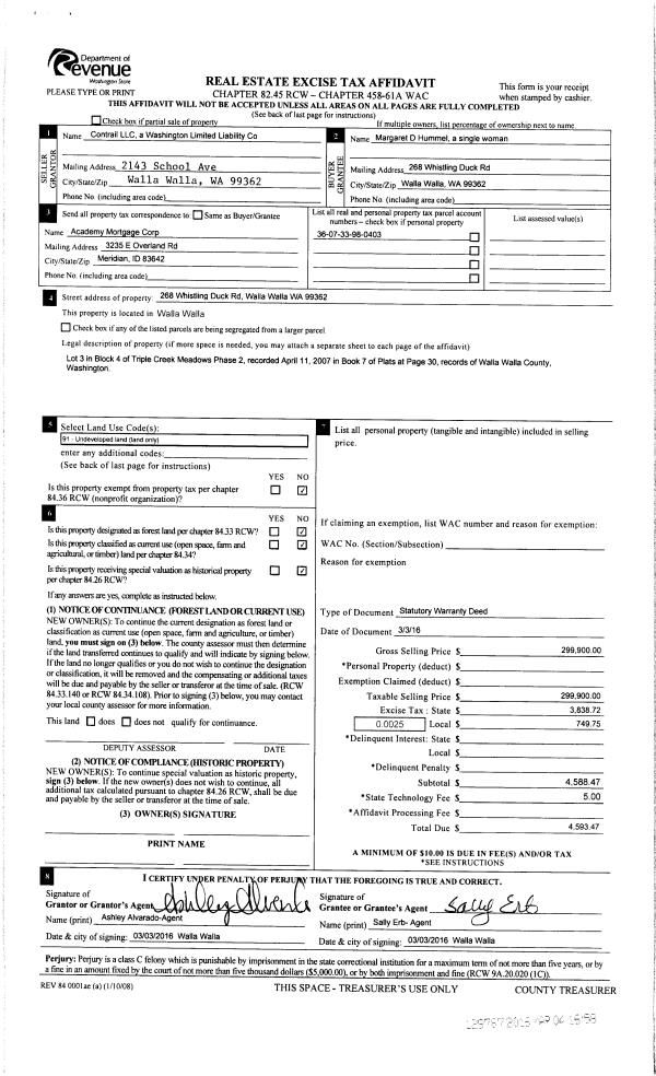 | 2 | 03/04/2016 | SWD | STATUTORY WARRANTY DEED | CONTRAIL LLC | HUMMEL MARGARET D | | | $299,900.00 | 129787 | 2016-01685 |