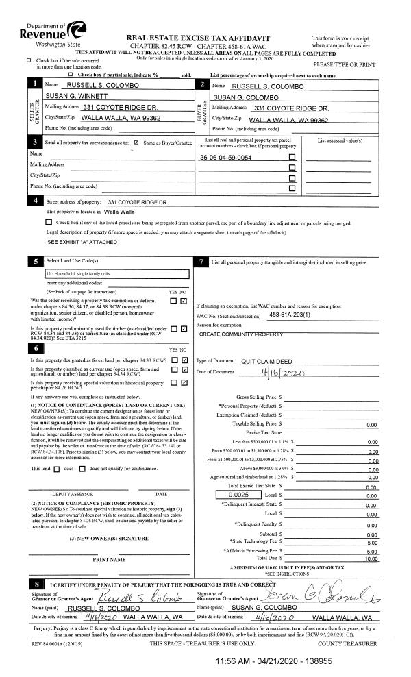 | 1 | 04/16/2020 | QCD | QUIT CLAIM DEED | COLOMBO RUSSELL S | COLOMBO RUSSELL S & SUSAN G | | | $0.00 | 138955 | 2020-03370 |