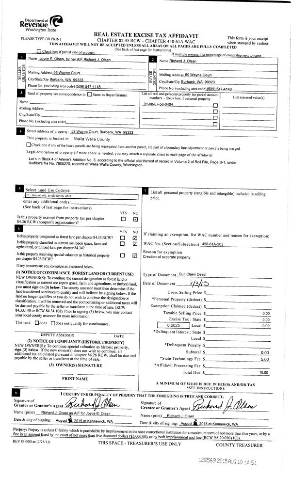 | 2 | 08/03/2015 | QCD | QUIT CLAIM DEED | OLSEN RICHARD J & JOYCE E | OLSEN RICHARD J | | | $0.00 | 128569 | 2015-06894 |