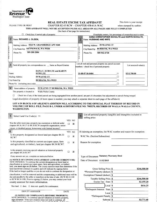 | 1 | 11/13/2015 | SWD | STATUTORY WARRANTY DEED | OLSEN RICHARD J | SCHULTE DANA CHRISTOPHER & KARYN | | | $246,500.00 | 129191 | 2015-09890 |