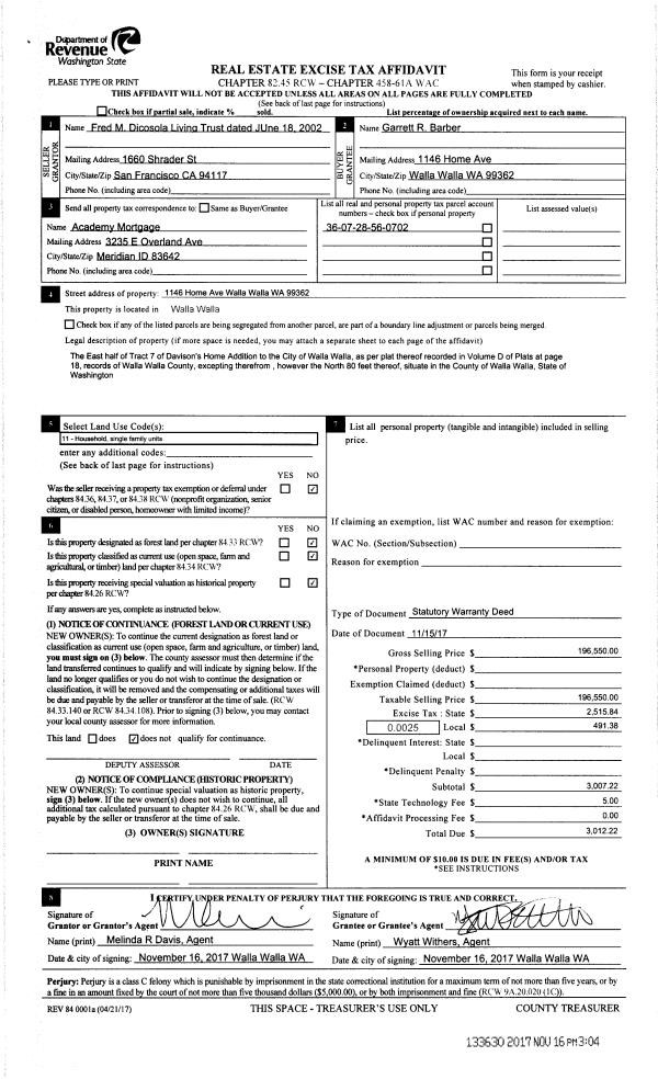| 1 | 11/16/2017 | SWD | STATUTORY WARRANTY DEED | DICOSOLA FRED M AS TRUSTEE OF THE | BARBER GARRETT R | | | $196,550.00 | 133630 | 2017-09261 |