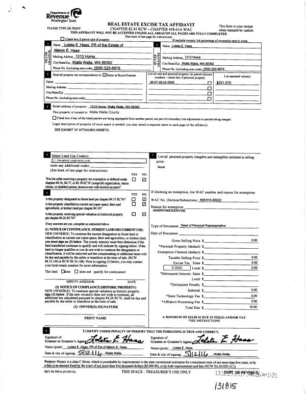 | 4 | 05/12/2016 | DPR | DEED OF PERSONAL REPRESENTATIVE | HAAS MELVIN E | HAAS LOLETA E | | | $0.00 | 131815 | 2017-00687 |