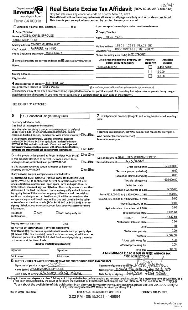 | 2 | 06/15/2023 | SWD | STATUTORY WARRANTY DEED | SPROUSE JACOB MICHAEL & SARA LIM | TANG MING | | | $675,000.00 | 145994 | 2023-03319 |
