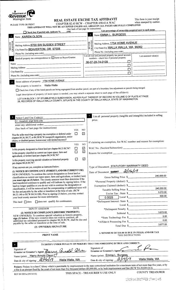 | 2 | 02/17/2017 | SWD | STATUTORY WARRANTY DEED | OLSON KAREN | BURGESS EMMA L | | | $240,000.00 | 131914 | 2017-01332 |