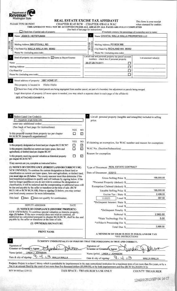 | 2 | 09/04/2013 | FUL | FULFILLMENT DEED | CHVATAL WALLA WALLA PROPERTIES LLC | | | | | 0 | 2014-02889 |