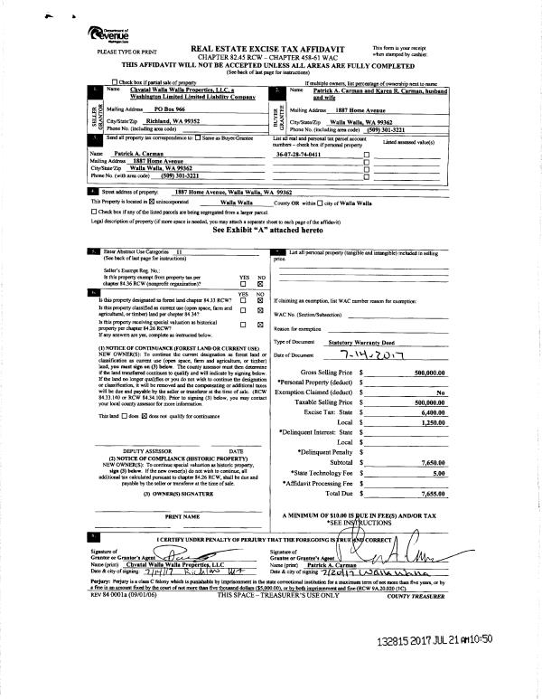 | 1 | 07/21/2017 | SWD | STATUTORY WARRANTY DEED | CHVATAL WALLA WALLA PROPERTIES LLC | CARMAN PATRICK A & KAREN R | | | $500,000.00 | 132815 | 2017-05561 |