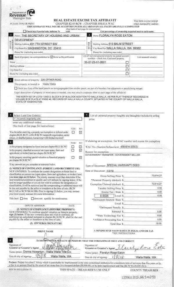 | 1 | 01/05/2018 | SWP | Special Warranty Deed | SECRETARY OF HOUSING & URBAN DEVELOPMENT | EATON FLORALYN ROSE | | | $73,514.00 | 133960 | 2018-00191 |