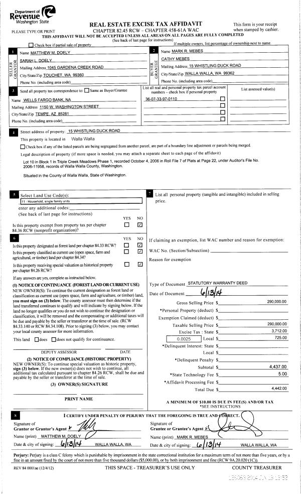 | 2 | 06/13/2014 | SWD | STATUTORY WARRANTY DEED | DOELY MATTHEW M & SARAH L | MEBES MARK R & CATHY | | | $290,000.00 | 126063 | 2014-04078 |