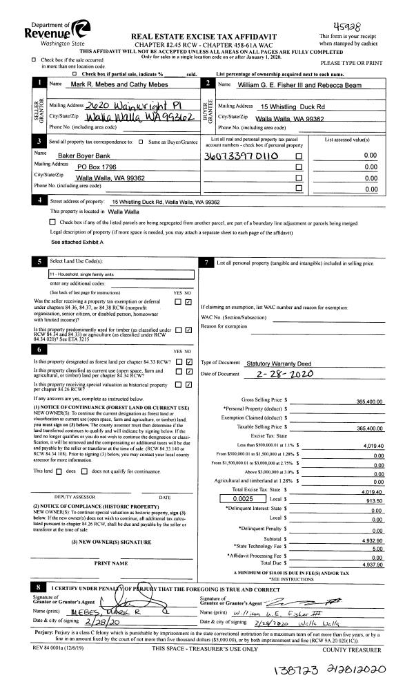 | 1 | 02/28/2020 | SWD | STATUTORY WARRANTY DEED | MEBES MARK R & CATHY | FISHER III WILLIAM G E & REBECCA BEAM | | | $365,400.00 | 138723 | 2020-01913 |