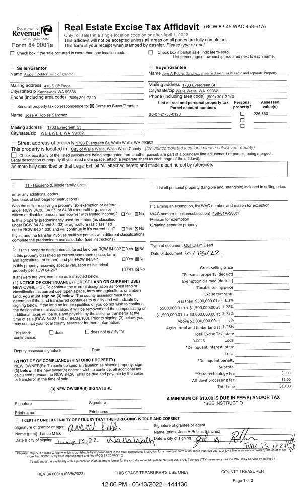 | 1 | 06/13/2022 | QCD | QUIT CLAIM DEED | ROBLES ARACELI | SANCHEZ JOSE A ROBLES | | | | 144130 | 2022-05004 |