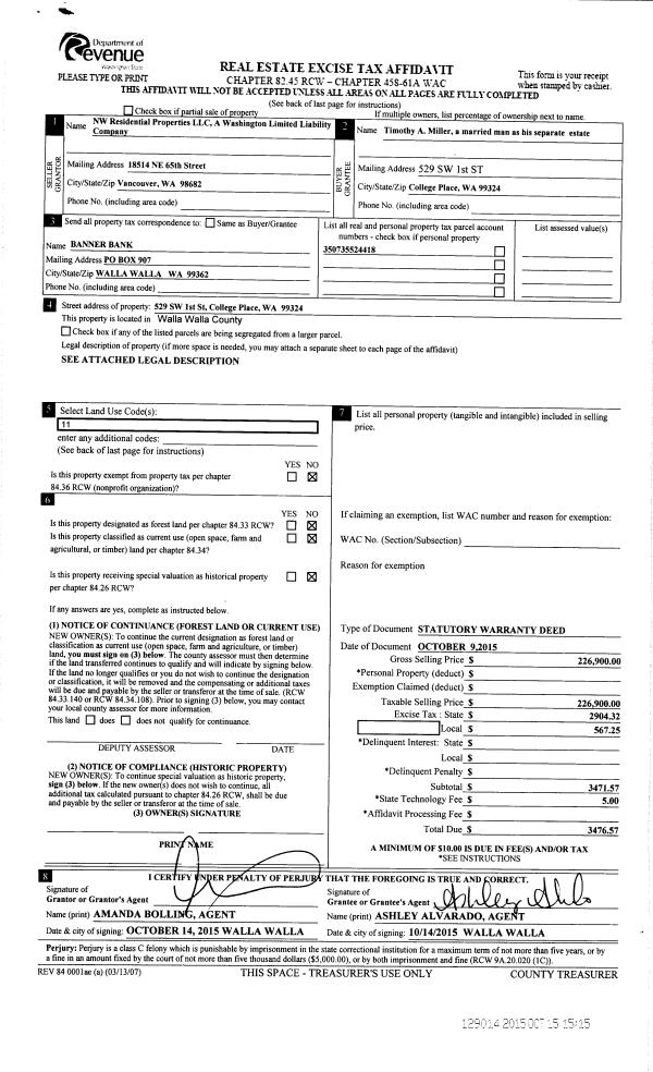 | 3 | 10/15/2015 | SWD | STATUTORY WARRANTY DEED | NW RESIDENTIAL PROPERTIES LLC | MILLER TIMOTHY A | | | $226,900.00 | 129014 | 2015-09051 |