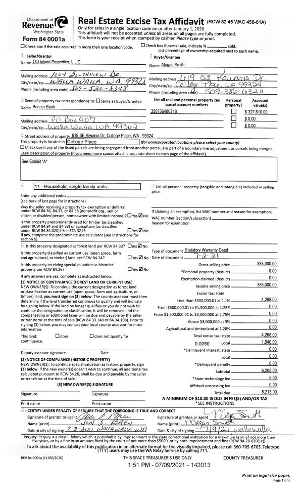 | 1 | 07/09/2021 | SWD | STATUTORY WARRANTY DEED | OLD INLAND PROPERTIES LLC | SMITH MEGAN | | | $388,000.00 | 142013 | 2021-08331 |