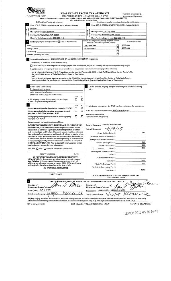| 4 | 03/21/2014 | SWD | STATUTORY WARRANTY DEED | PALOUSE FALLS INVESTOR GROUP LLC | BREN JON S | | | $212,500.00 | 125595 | 2014-01913 |