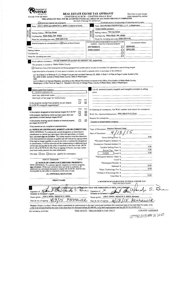 | 2 | 04/13/2015 | SWD | STATUTORY WARRANTY DEED | BREN JON S & WENDYE S | OLD INLAND PROPERTIES LLC | | | $0.00 | 127792 | 2015-03083 |
