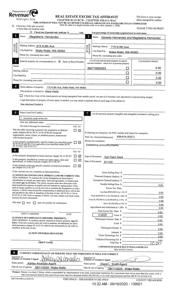 | 1 | 09/16/2020 | QCD | QUIT CLAIM DEED | HERNANDEZ MAGDALENA | HERNANDEZ GERARDO & MAGDALENA | | | | 139921 | 2020-09469 |