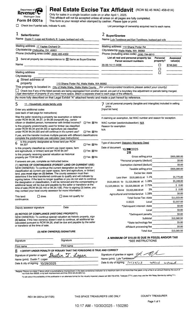 | 1 | 10/30/2025 | SWD | STATUTORY WARRANTY DEED | LOGAN DUSTIN T & KIMBERLY R | TUMBLESON LYLE & KARI | | | $935,000.00 | 150280 | 2025-06721 |