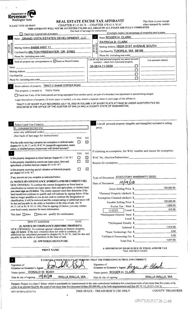 | 4 | 10/26/2015 | SWD | STATUTORY WARRANTY DEED | GRAND VISTA ESTATES DEV LLC | CLARK ROGER H & PATRICIA B | | | $125,000.00 | 129073 | 2015-09346 |
