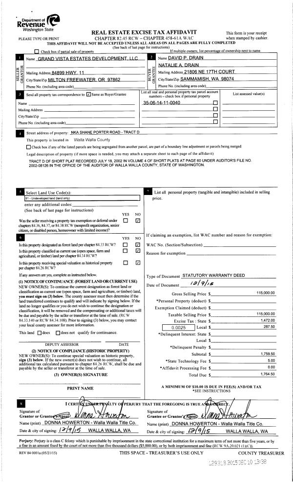 | 1 | 12/10/2015 | SWD | STATUTORY WARRANTY DEED | GRAND VISTA ESTATES DEV LLC | DRAIN DAVID P & NATALIE A | | | $115,000.00 | 129318 | 2015-10548 |