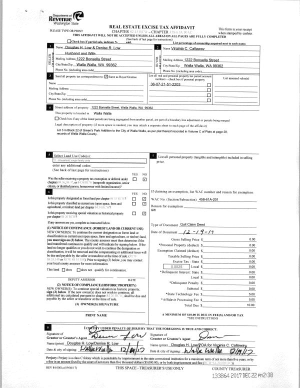 | 2 | 12/22/2017 | QCD | QUIT CLAIM DEED | CALLAWAY LIFE ESTATE | CALLAWAY VIRGINIA C | | | $0.00 | 133864 | 2017-10332 |