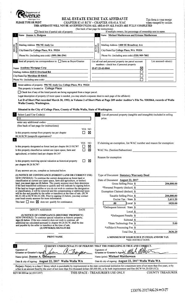 | 1 | 08/24/2017 | SWD | STATUTORY WARRANTY DEED | HODGSON JEANNE A | MATTHEWSON MICHAEL & ERIENNE | | | $204,000.00 | 133076 | 2017-06615 |