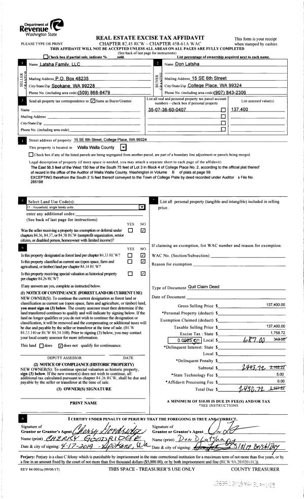 | 1 | 05/31/2019 | QCD | QUIT CLAIM DEED | LATSHA FAMILY LLC | LATSHA DON | | | $137,400.00 | 136991 | 2019-03735 |