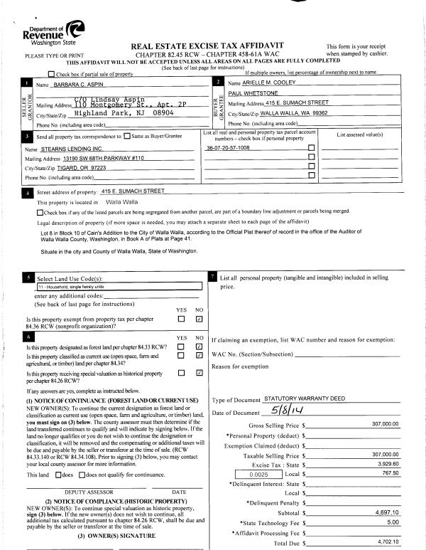| 1 | 05/13/2014 | SWD | STATUTORY WARRANTY DEED | ASPIN BARBARA C | WHETSTONE PAUL | | | $307,000.00 | 125875 | 2014-03242 |