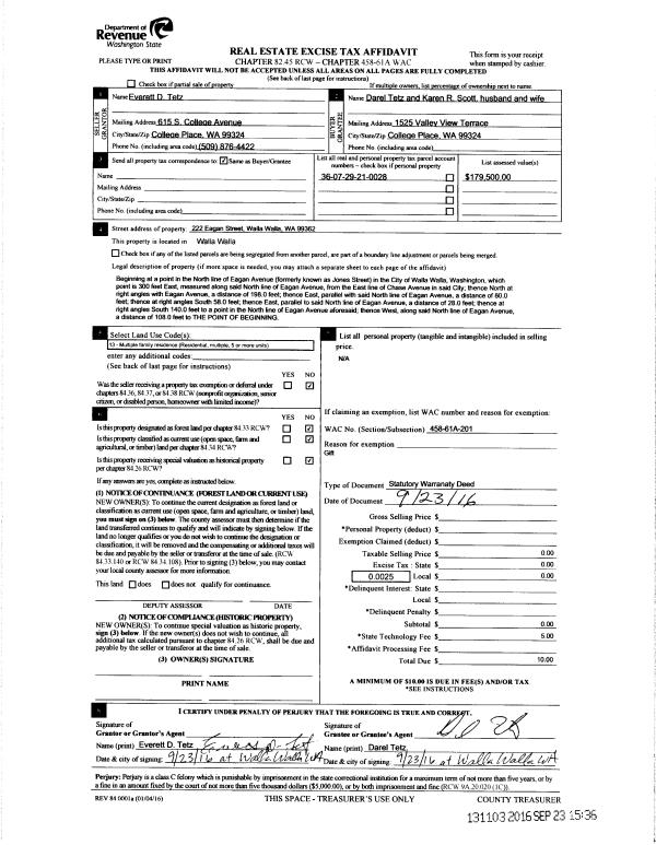 | 2 | 09/23/2016 | SWD | STATUTORY WARRANTY DEED | TETZ EVERETT D | TETZ DAREL | | | | 131103 | 2016-07805 |