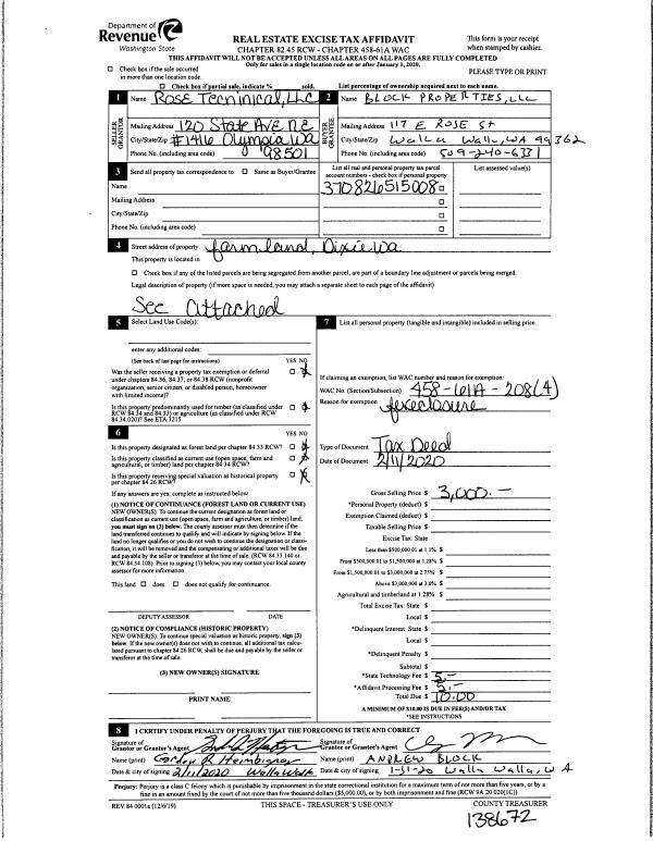 | 2 | 02/11/2020 | TAX AFF | TAX AFFIDAVIT | ROSE TECHNICAL LLC | BLOCK PROPERTIES LLC | | | $0.00 | 138672 | 2020-01695 |