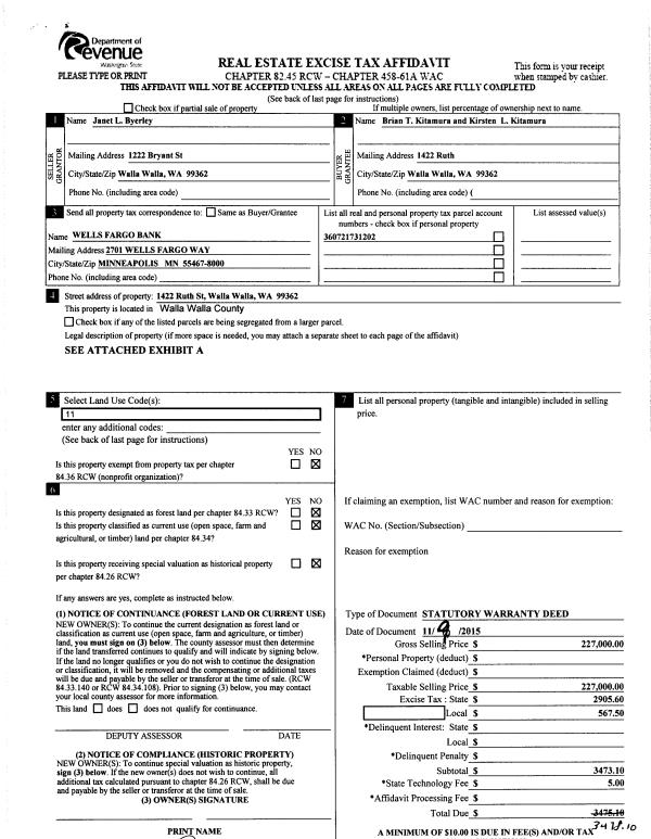 | 1 | 11/10/2015 | SWD | STATUTORY WARRANTY DEED | BYERLEY JANET L | KITAMURA BRIAN T & KIRSTEN L | | | $227,000.00 | 129170 | 2015-09806 |