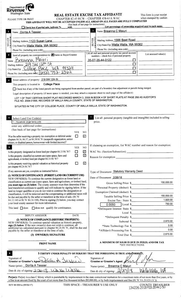 | 2 | 02/28/2018 | SWD | STATUTORY WARRANTY DEED | TESSIER DORITA A | MAIURI BREANNA C | | | $150,000.00 | 134226 | 2018-01626 |