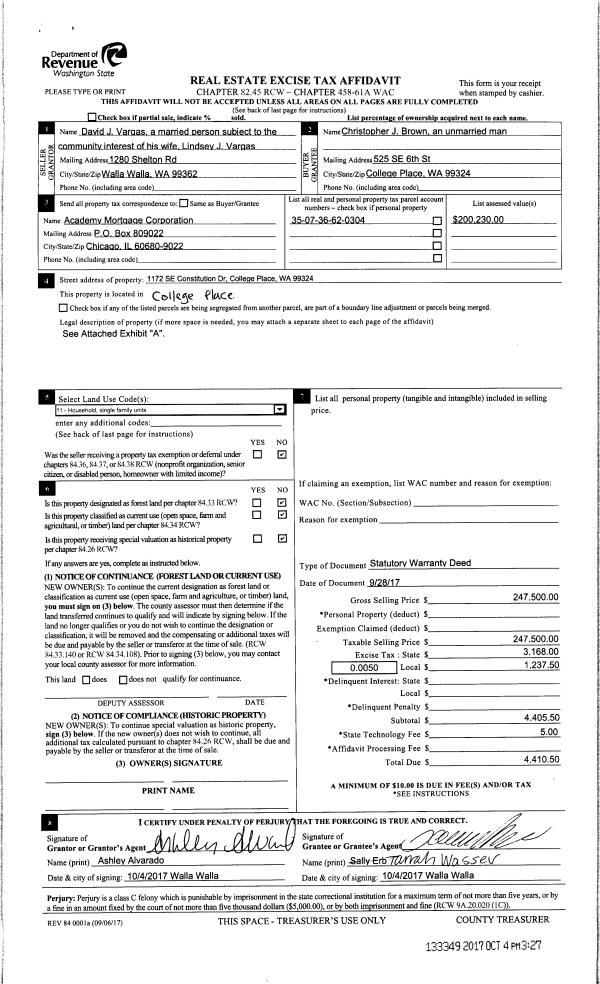 | 1 | 10/04/2017 | SWD | STATUTORY WARRANTY DEED | VARGAS DAVID J | BROWN CHRISTOPHER J | | | $247,500.00 | 133349 | 2017-07890 |