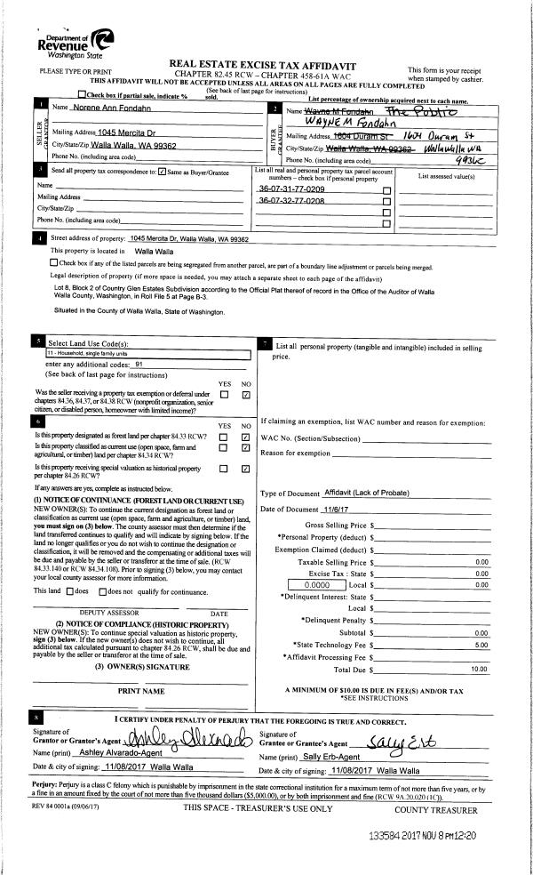 | 2 | 11/06/2017 | LOPA | LACK OF PROBATE AFFIDAVIT | FONDAHN NORENE ANN | FONDAHN WAYNE M | | | $0.00 | 133584 | 2017-08994 |
