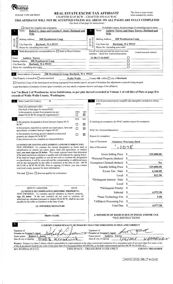 | 1 | 01/17/2018 | SWD | STATUTORY WARRANTY DEED | JONES ROBERT L & LORETTA F | TORREY ANDREW & STACY | | | $325,000.00 | 134003 | 2018-00488 |