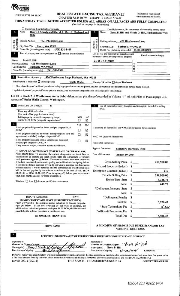 | 1 | 08/22/2014 | SWD | STATUTORY WARRANTY DEED | MARCH HARRY J & SHERYL A | HILL BRETT P & NICOLE D | | | $259,900.00 | 126504 | 2014-06114 |