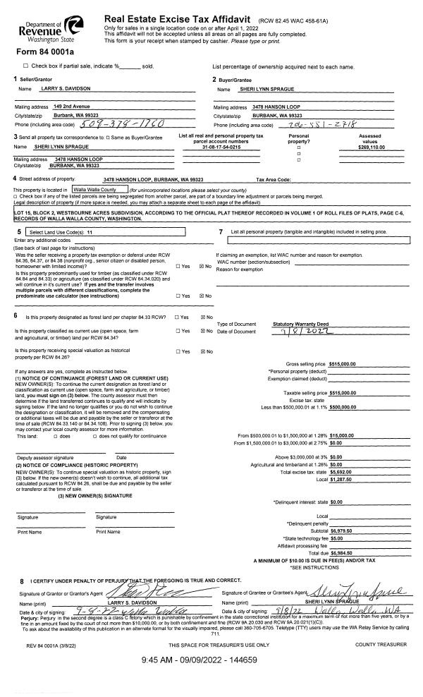 | 1 | 09/09/2022 | SWD | STATUTORY WARRANTY DEED | DAVIDSON LARRY S | SPRAGUE SHERI LYNN | | | $515,000.00 | 144659 | 2022-07534 |